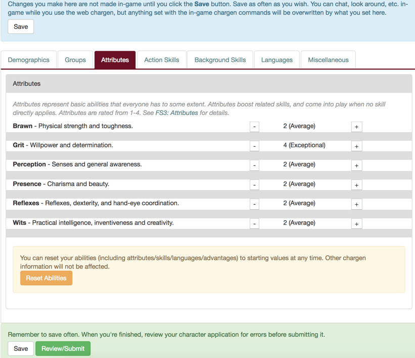 I’m a bit leery of having the button without the description text, because a) someone might get confused and think that it only reset the abilities on that particular screen, or b) they might worry that it is going to reset their name/groups/etc. too. So I think I’m just going to leave the reset off. It would be convenient to have (which is why there’s an in-game command to do it) but you don’t strictly need it to complete CG entirely on the web.